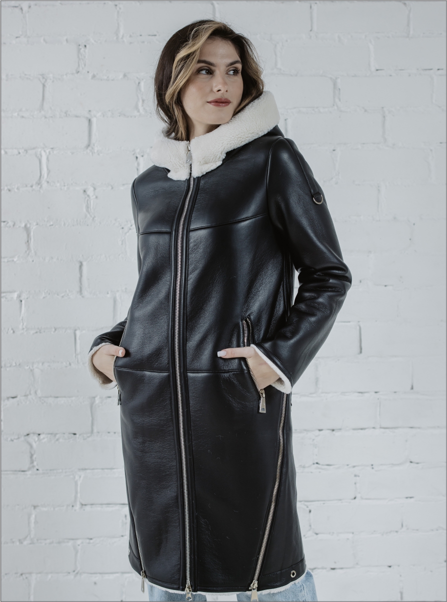 Эко дубленка «Бруна» капюшон черный/белый