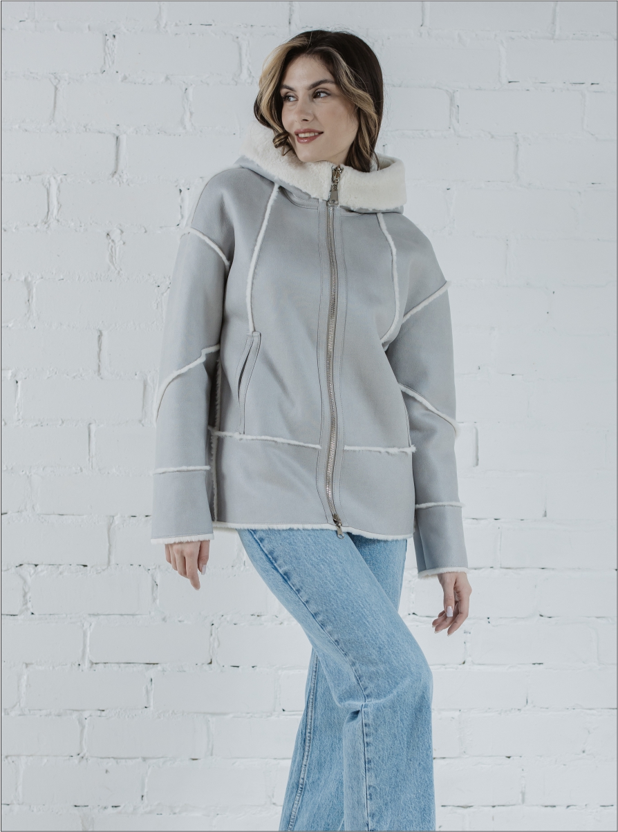-Эко дубленка «Лара» капюшон серый/белый цвета серый/белый