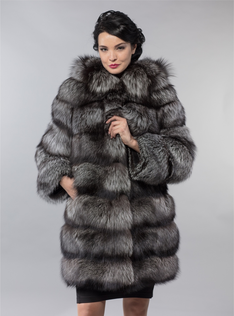 Шуба из меха серебристо - черной лисицы. Длинный, игристый, блестящий мех лисы очаровывает! Изделие имеет прямой силуэт и выполнено в модном поперечном расположении шкур с элементами росшива: шкурки лисы чередуются с замшей. Воротник — апаш. Рукав полной длины. Шуба легко трансформируется в короткое изделие с укороченными рукавами. Рукав 7/8 можно носить под длинную перчатку, а в короткой куртке из чернобурой лисицы вам будет комфортно за рулем автомобиля. Карманы и подол изделия отделаны замшей. Это защитит шубу от лишнего истирания. Шуба из меха с длинным ворсом подходит для решительных и стремящихся к достижению людей. Придает уверенности!